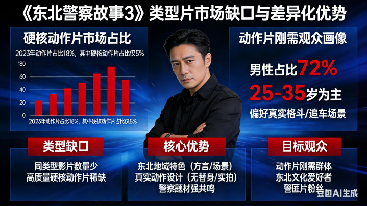 3. 类型片市场缺口:近年来,纯粹的、高质量的硬核动作片在院线市场并不算多。在好莱坞超英视觉大片和国产情感大片之外,《东北警察故事3》如果能保持高水准打斗,有机会吸引动作片刚需观众,形成差异化优势。